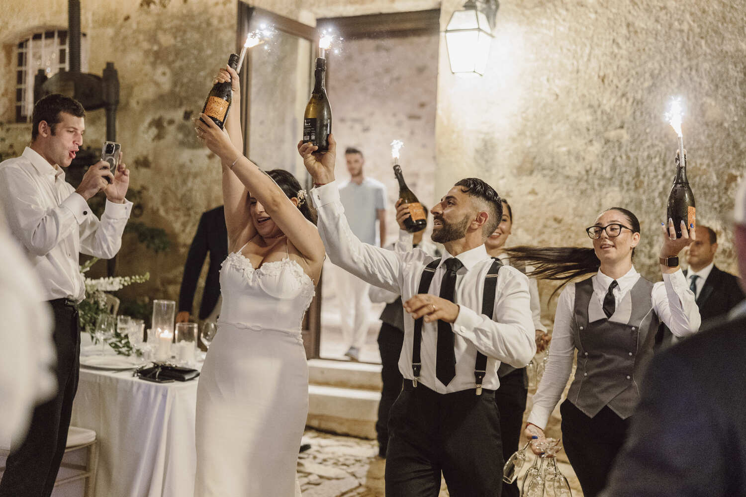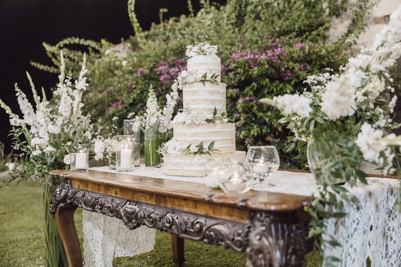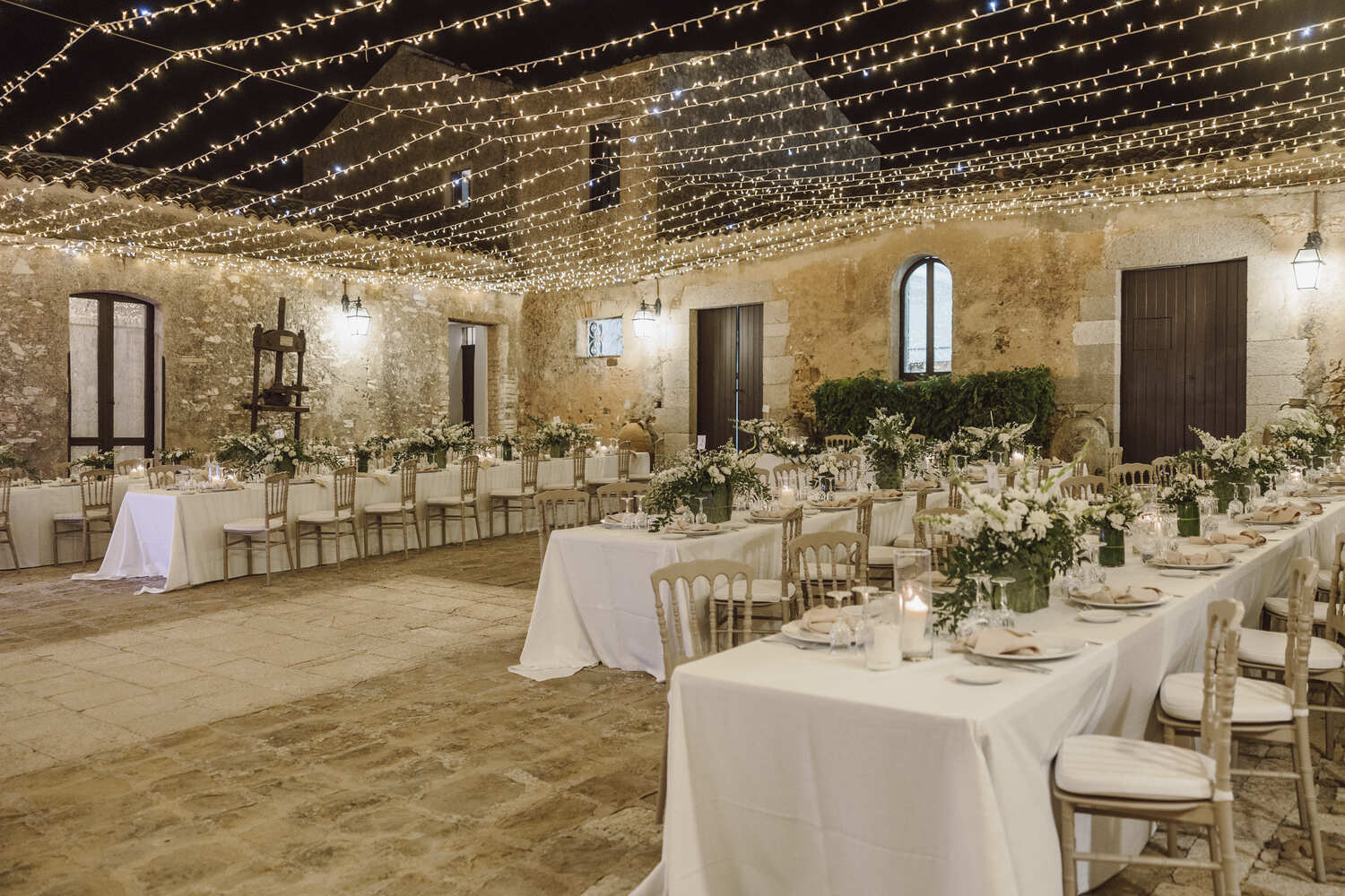 La cerimonia ha preso forma su una terrazza-giardino con antico fontanile, accompagnata dalla luce calda del tramonto sulla baia; la cena nel chiostro interno del baglio, uno spazio dal fascino senza tempo, è stata illuminata da candele e da un cielo stellato che ha restituito intimità e romanticismo. Il taglio della torta, all’esterno, sotto un rosone di luminarie tradizionali, ha concluso il racconto con un chiaro richiamo alla cultura siciliana.