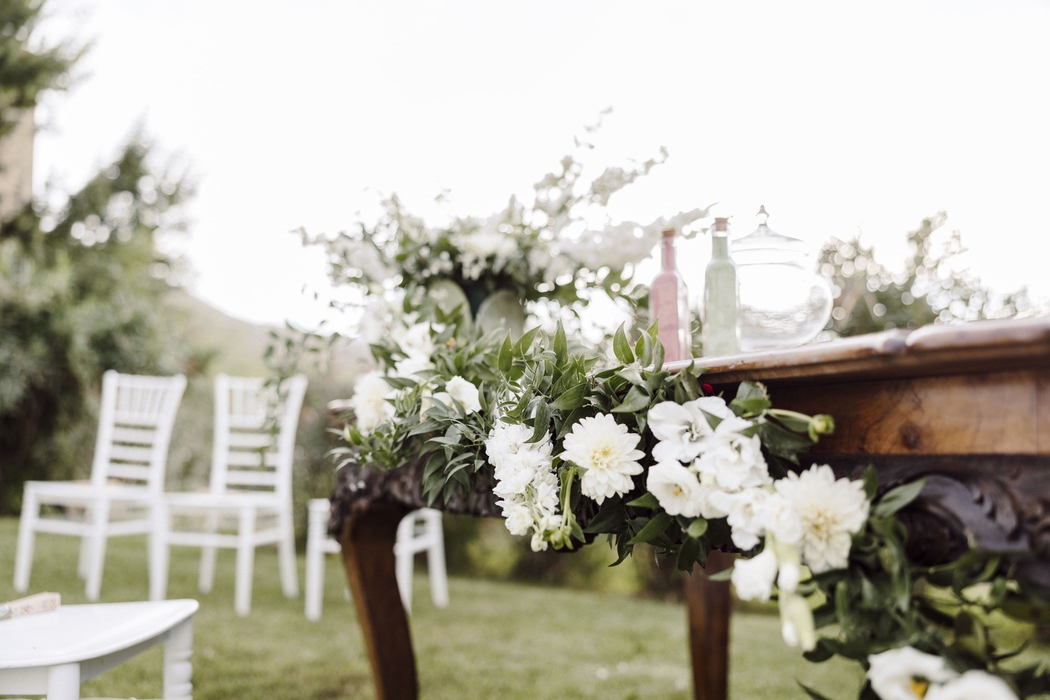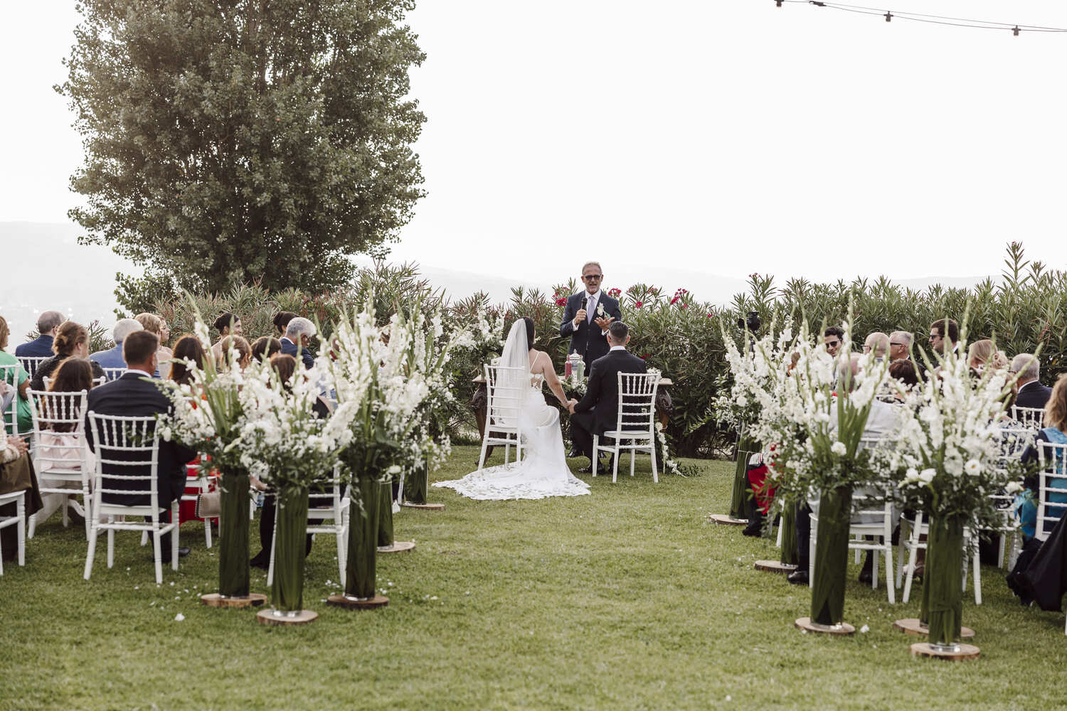 La progettazione è partita dall’ascolto e dal dialogo con il luogo: un baglio dei primi del Novecento immerso nei vigneti sulle colline intorno a Scopello, con una vista sul Monte Erice e la Baia di Cornino da un lato e sul Golfo di Castellammare dall’altro. La location, scelta anche per ospitare la cerimonia oltre al ricevimento, evocava già emozioni forti negli sposi, soprattutto grazie ai colori della natura circostante. Da qui la decisione di lavorare su una palette sobria di bianchi e verdi, in continuità con il paesaggio, e su allestimenti essenziali, curati nei materiali e nei dettagli.